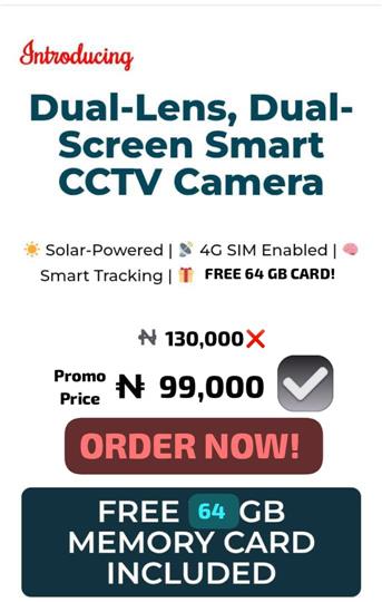 INTRODUCING: 2 (Dual) LENS SOLAR POWERED CCTV CAMERA πŸ”΄ONE WEEK PRICE SLASH!πŸ”΄ 2 (Dual) Lens 4G PTZ Camera+ 360Β° Security & Clarity Protect what matters most with our Ultra HD DOUBLE Lens PTZ Camera, powered by Solar & 4G Network β€” MONITOR YOUR HOME, OFFICE, or BUSINESS LIVE FROM YOUR PHONE, ANYTIME, ANYWHERE IN THE WORLD! πŸ“±πŸŒ πŸ”₯ SPECIAL EASTER OFFER(Limited Stock!) Actual Price: *?130,000* ? ? *Promo Price ?99,000 = 2 Lens Camera 🎁 *FREE 64 GB SD CARD + Free DELIVERY & INSTALLATION*! 🚚 *Payment on Delivery Nationwide* (All 36 States) 🎯 Top Features: ? DOUBLE LENS Ultra High-Resolution Camera ? 360Β° Rotation & Zoom PTZ ? Solar Powered – No NEPA Needed ? Night Vision & Motion Detection ? Long-Lasting Battery Life πŸ›‘? Install in: Homes | Offices | Shops | Warehouses | Farms πŸ“ž ORDER NOW