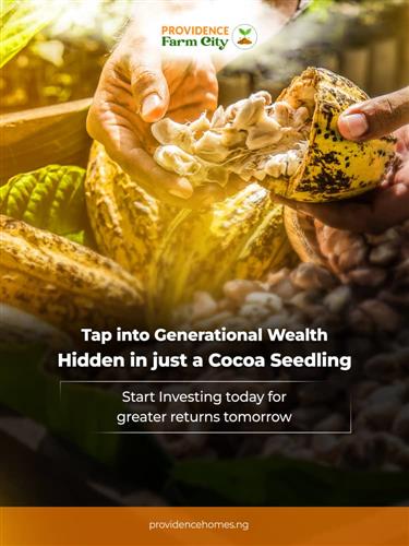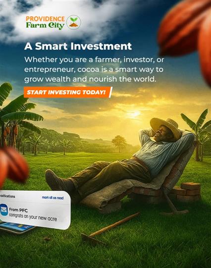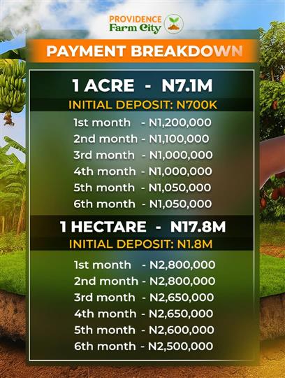 1 Acre of Farm Land (6 plots)….......N5m Statutory Fee (documentation and development) 1 Acre…..........N1.3m Setup fee for 1 Acre Cocoa 500 trees = 500k Plantain 500 trees = 300k Total cost for 1 acre including planting = 7,100,000 million naira Initial deposit: N700,000 1 Hectare of Farm Land (15 plots) .......... N12.5m Statutory Fee (documentation and development) 1 hectare…......N3.3m Setup fee Cocoa 1300 trees = N1.250m Plantain 1300 trees = N750k Total cost 1 hectare including planting = N17,800,000 million naira. Initial deposit: N1.8 million Projection for Cocoa/Plantain Farm 1 Acre Annual Projection Cocoa 1000kg from the 3rd year. Plantain 1500 bunch yearly. 1 Hectare Annual Projections Cocoa 2500 kg from the 3rd year Plantain 4000 bunch yearly.